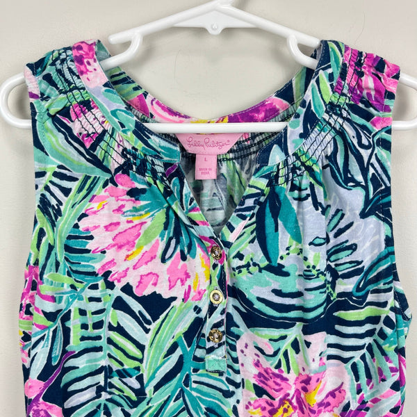 Lilly Pulitzer Girls Mini Essie Dress Slathouse Soiree. Girls size large (8-10 years). Sleeveless light weight dress with button placket. Navy base with green, pink, and blue tropical flower print. Great condition with no flaws noted! Perfect for summer!