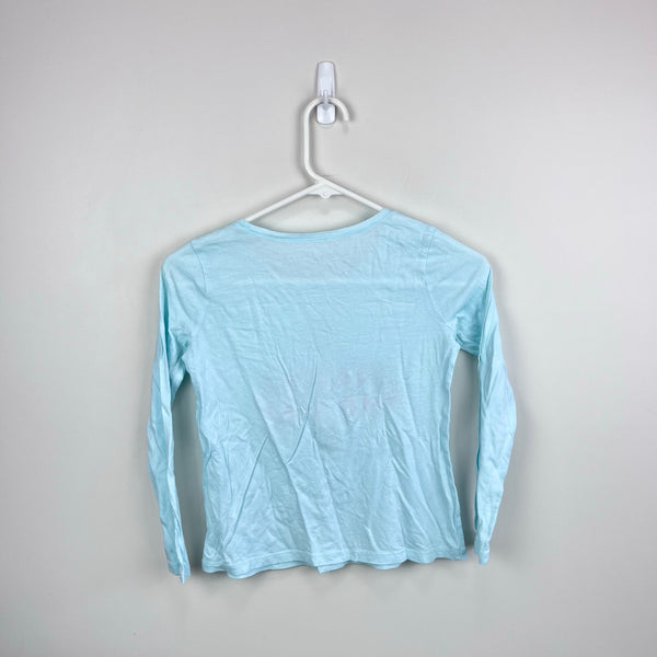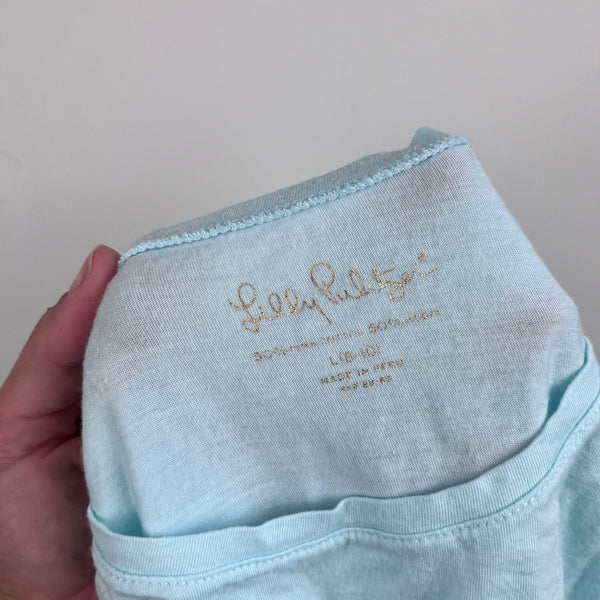 Lilly Pulitzer Kay Top Pink Sunset Seas the Day Graphic Tee Shirt. Girls size large (8-10 years). Long sleeve, light weight aqua green top with pink lettering and gold fish and xx, Lilly. Excellent condition; just wrinkled from being in my daughter's drawer!