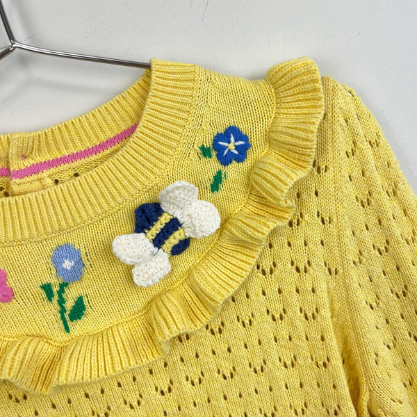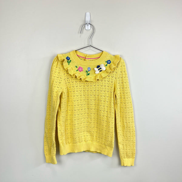 Mini Boden Pointelle Knit Sweater Top Soft Lemon. Girls size 8-9 years. Accidentally went through the wash with the tag on it (on cold, line dried). Never worn, despite my daughter insisting she needed this in her wardrobe. (And despite it being the most gorgeous sweater ever!) Fun ruffle along the neck with embroidered flowers and bumblebee. Buttons in the back.