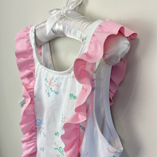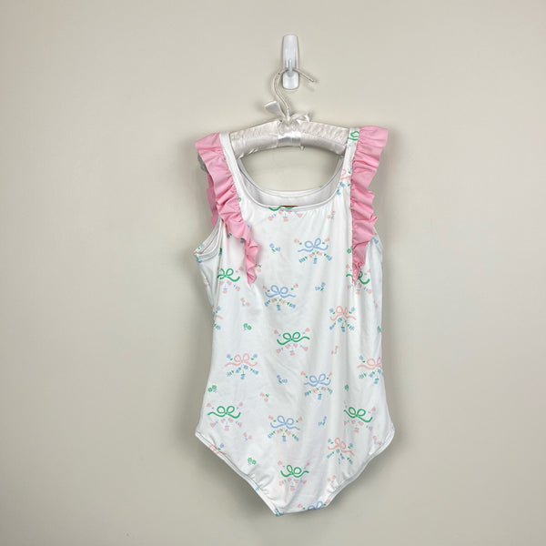 The Beaufort Bonnet Company Bowhicket Bathing Suit Grandmillennial-esque with Palm Beach Pink. Girls size 10. Brand new with tags (NWT). The sweetest one piece white bathing suit with ribbon print and pink ruffles down the sides. Palm Beach Pink, Beale Street Blue, and Grace Bay Green. 88% Nylon, 12% Spandex. Perfect for a beach vacation!