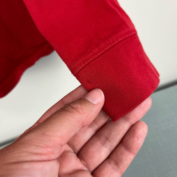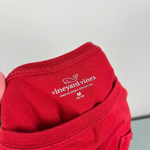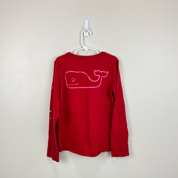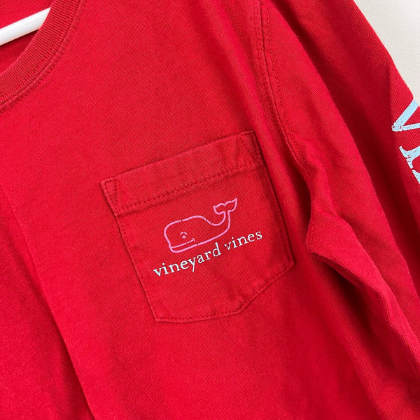 Vineyard Vines Long-Sleeve Whale Graphic T-Shirt. Girls size medium (10-12 years). Bright red top with pink whale logo on front pocket and in back. Vineyard Vines down the sleeve in blue. Small spot on the cuff (see photo; untreated).