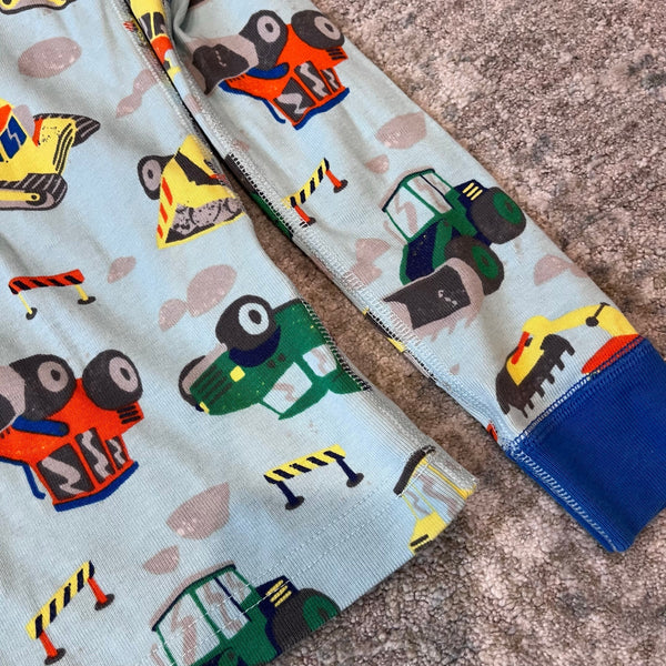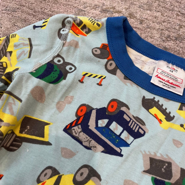 Hanna Andersson Construction Site Long John PJs. Boys size 130 cm (US 8 years). Two piece organic cotton pajama set. Long sleeve top and pants bottom. Light blue with colorful trucks, tractors, and construction equipment. Excellent condition.