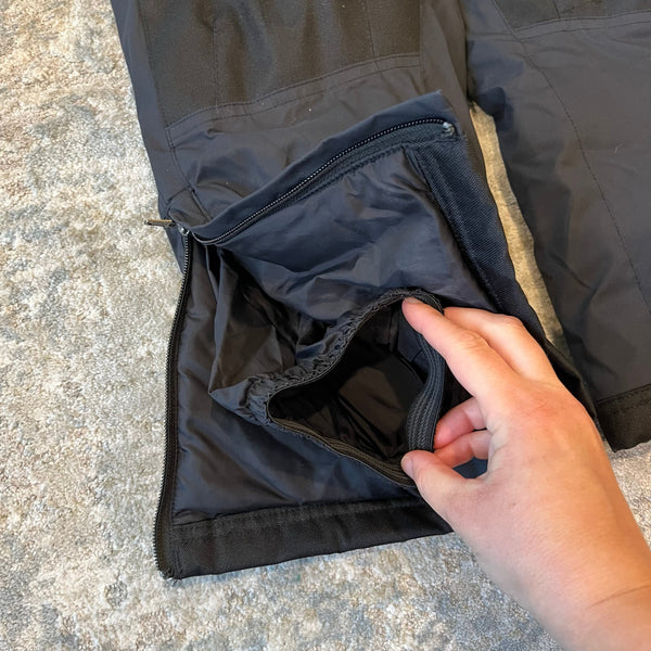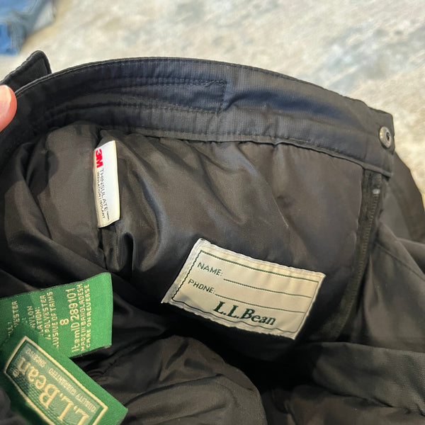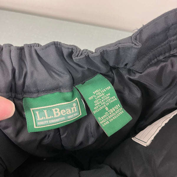 L.L. Bean Kids' Waterproof Glacier Summit Insulated Snow Pants Black. Boy or girl size 8. Features elasticized waist with adjustable velcro tabs, zippered hand warmer pockets, snow gaiters, and zip boot vents at the hem.