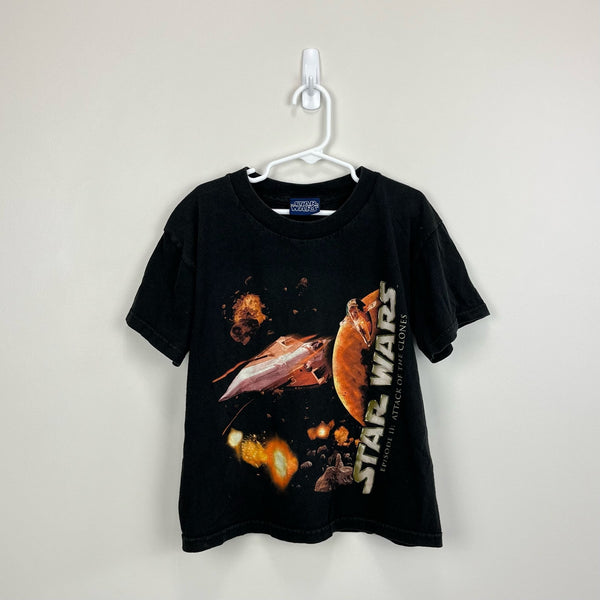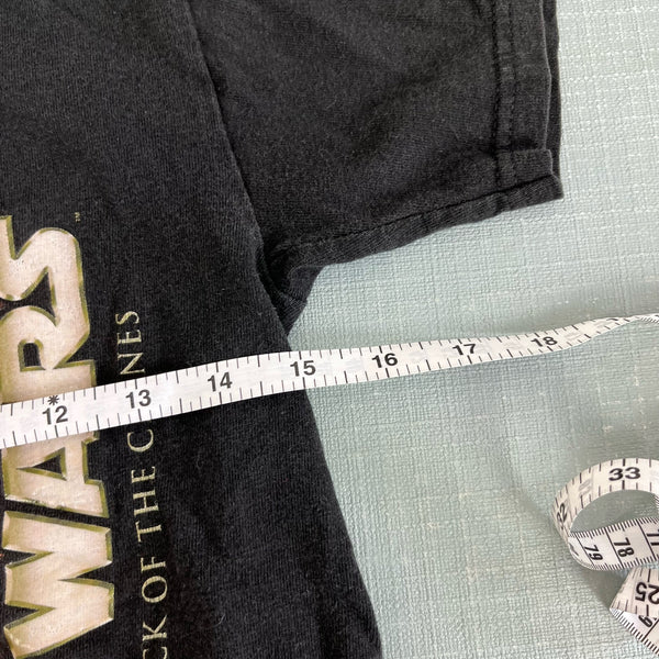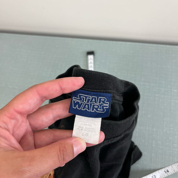 Star Wars Episode II: Attack of the Clones T-Shirt. Youth boy or girl size large; see photos for measurements. Casual short sleeve black top with scenes from the 2002 film. Seemed relaxed in the body but no stains, tears, etc.