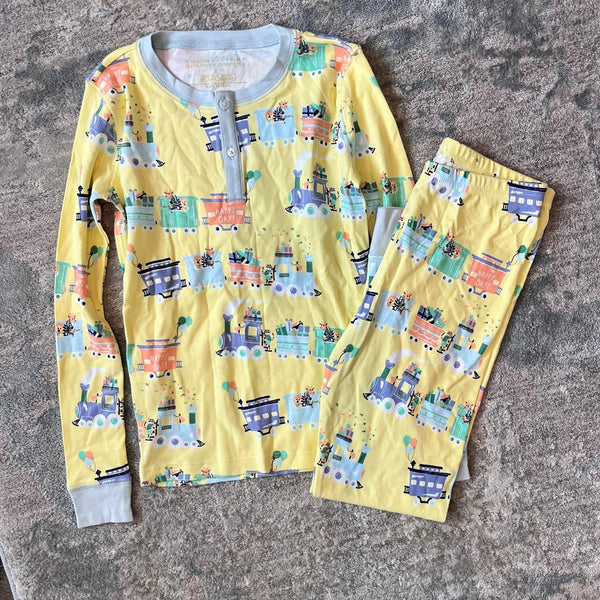 The Beaufort Bonnet Company Sutton's Sweet Dream PJs Set Party Train with Buckhead Blue. Boys size 8. Brand new without tag (NWT). Two piece, super soft pima cotton pajama set. Includes long sleeve button top and pull on pants bottom. Yellow with fun party train design - perfect for a birthday!