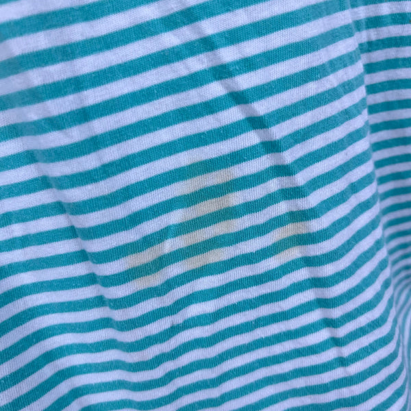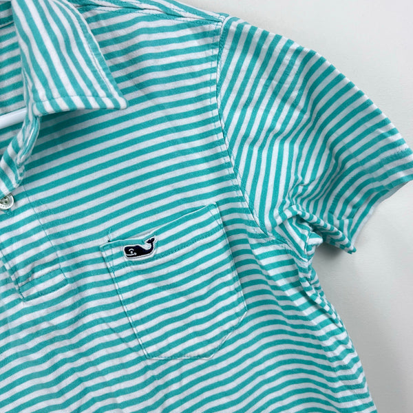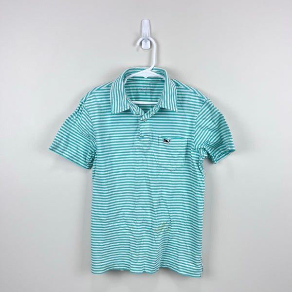 Vineyard Vines Green & White Striped Polo Shirt. Boys size small (8-10 years). Soft pima cotton short sleeve collared top in green and white stripes. Signature navy whale on chest pocket. Light mark (untreated; see photo) and small tear at the pocket (not visible when wearing).