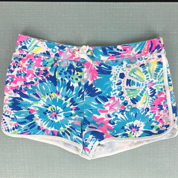 Lilly Pulitzer Girls Little Chrissy Short Multi Dive In Reduced. Girls size extra large (12-14 years). Cozy terry pull on shorts with elastic waist, center front tie, and contrast binding. Fun tie dye style print in shades of blue, pink, and yellow. Light wear/fade; no stains, tears, etc.