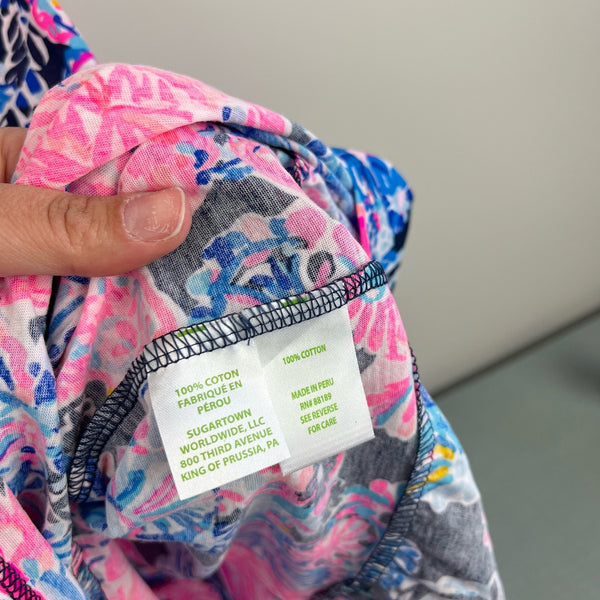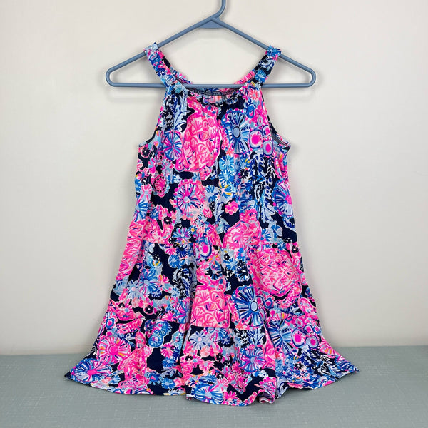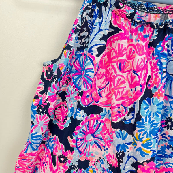Lilly Pulitzer Girls Mini Loro Dress High Tide Navy in Turtle Amazement. Girls size extra large (12-14 years). Tiered tank dress with a swing fit and ruffle trim. Soft cotton jersey fabric is perfect for hot summer days! Gorgeous pink and blue turtle flower print. Excellent condition.