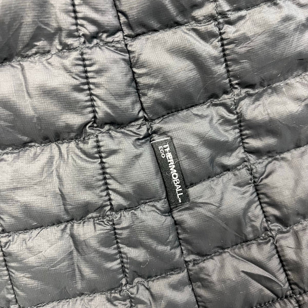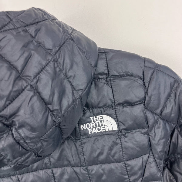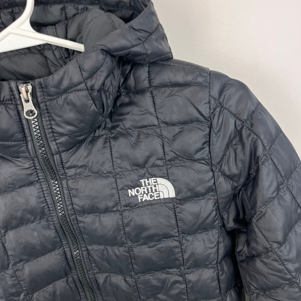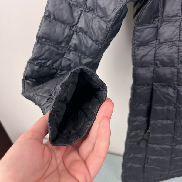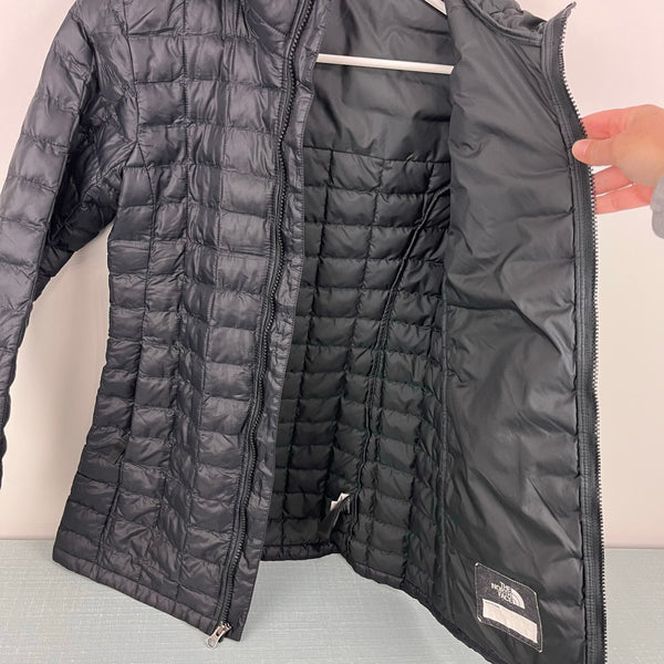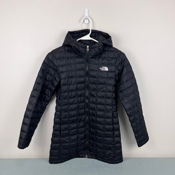 The North Face Girls' Thermoball Parka Winter Coat Black. Girls size medium (10-12 years). Full zip quilted, light weight puffer jacket. Fixed hood. Longer length; hits below the hips. Logo on the chest and back. Great condition with just a couple spots of loose stitching in the quilting and a minuscule snag (see close up photos).