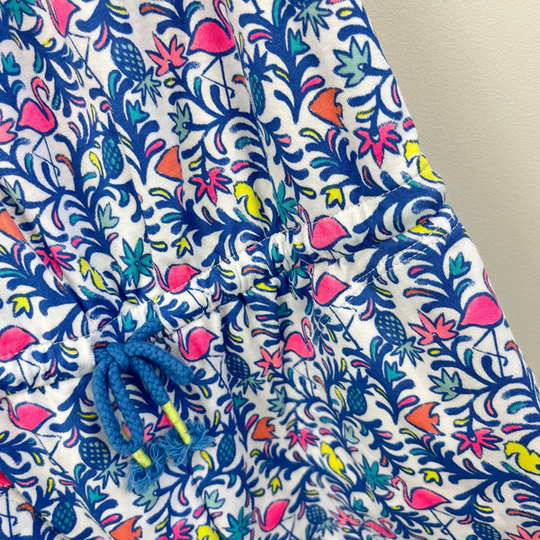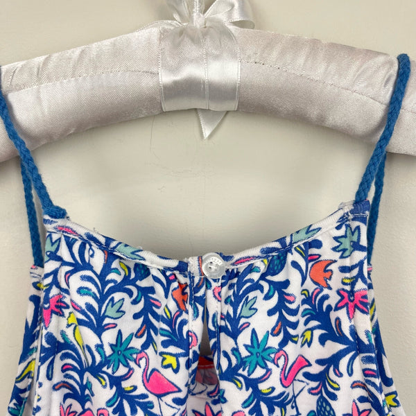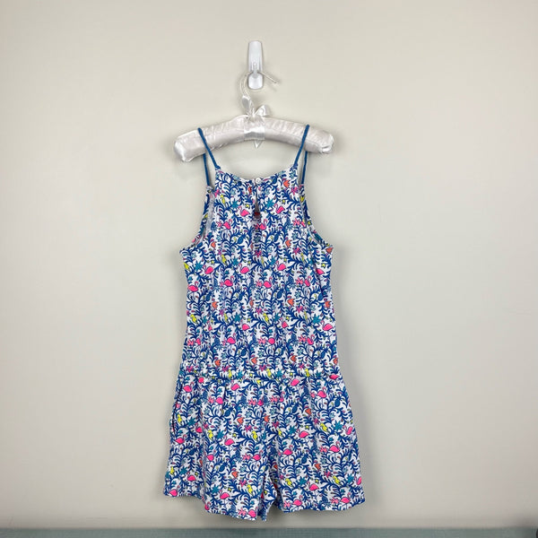 Vineyard Vines Girls Floral Flamingos Knit Romper. Girls size medium (10-12 years). Sleeveless one piece with colorful print - flowers, pineapples, and flamingos! Nautical rope straps and tie at the waist. Has pockets! Super soft 100% pima cotton. Machine washable. Embroidered whale at the hem. Small hole in back where stitching is undone (see close up photo of size).