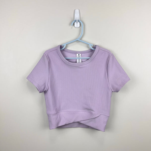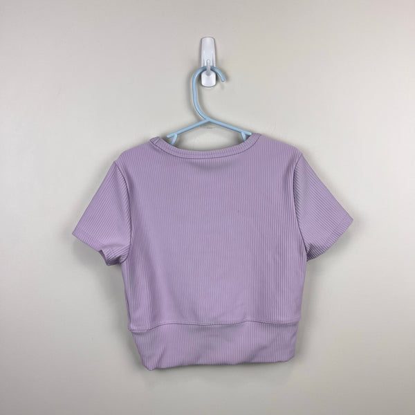Yogalicious Girls Maisie Rib Crossover Top Purple. Girls size large (12 years). Short sleeve ribbed top with crossover waistband. Pretty lilac color. Perfect for yoga, the gym, or every day casual wear! Great condition with no flaws noted.