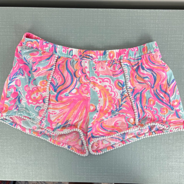 Lilly Pulitzer Girls Pink Pout Too Much Bubbly Chela Shorts. Girls size extra large (12-14 years). Cozy, light weight jersey cotton shorts in pink and blue pattern. Pull on style with elastic waist. Fun pom pom trim. Light wear.