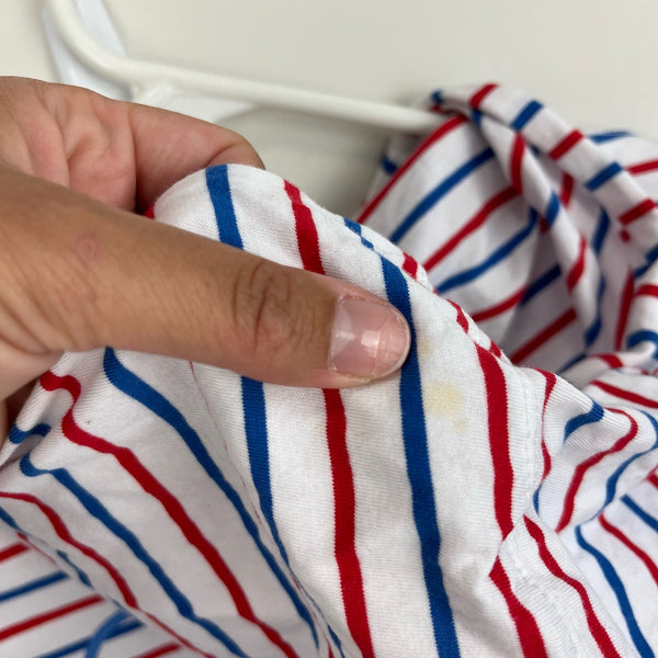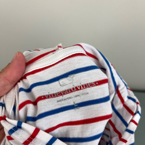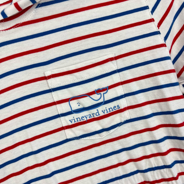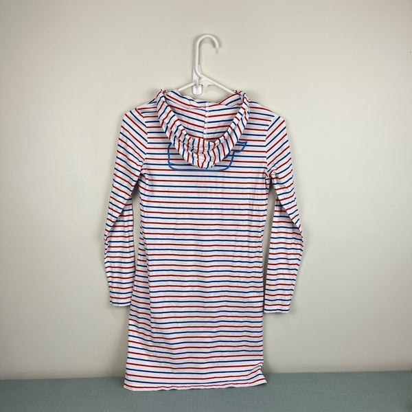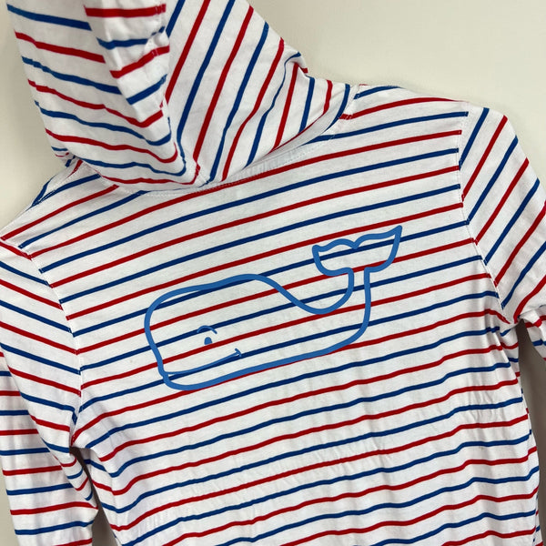 Vineyard Vines Girls Long-Sleeve Whale Hoodie Tee Dress. Girls size large (14 years). Long sleeve t-shirt dress in red, white, and blue stripes. Fixed hood. Signature, preppy whale logo on the pocket and in the back. Faint mark on hood (see last photo; untreated), but otherwise great condition. Great for casual summer wear or throwing over a bathing suit!