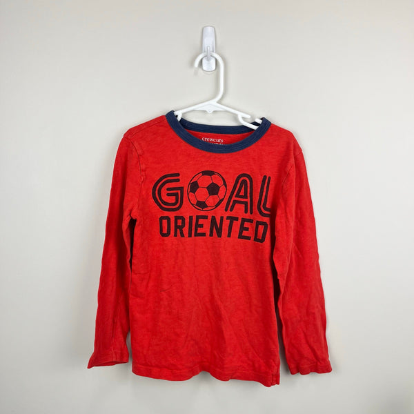J. Crew Kids Long Sleeve Red Soccer Tee Shirt. Boy or girl size 6-7. Casual red top with navy blue neckline and "Goal Oriented" on the chest with a soccer ball for the O. Light mark (see photo; untreated) but no other flaws noted.