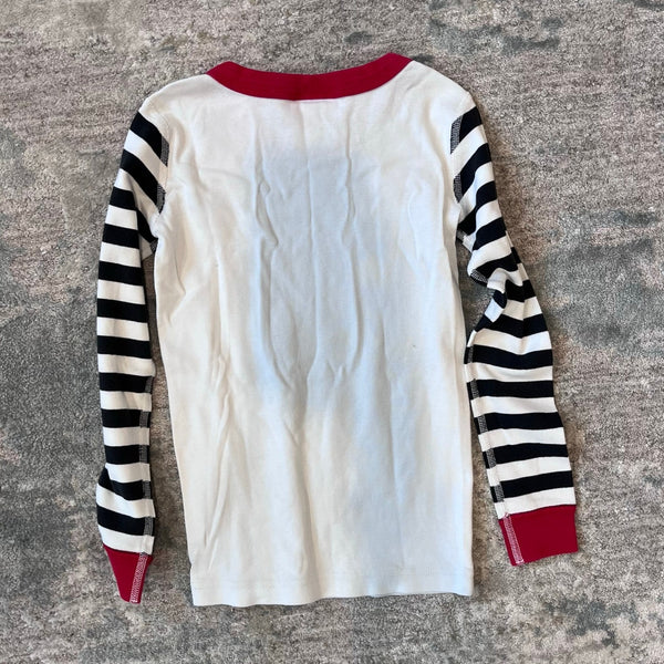 Hanna Andersson Long John PJs Mickey Mouse. Boys size 120 cm (US 6-7 years). Two piece pajama set featuring Disney's Mickey Mouse. Long sleeve top and matching stripes pants bottom. Black and white with red. Light marks (see last photo; untreated).
