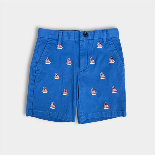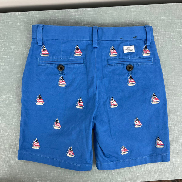 Vineyard Vines Boys' Embroidered Stretch Breaker Shorts Tide Blue. Boys size 6. I am 99% sure my son never wore these and they are brand new without tag (NWOT). Classic, preppy style! Bright blue chino shorts with adjustable tabs in the waist and patriotic American flag ships. Brother match (5T) available separately!