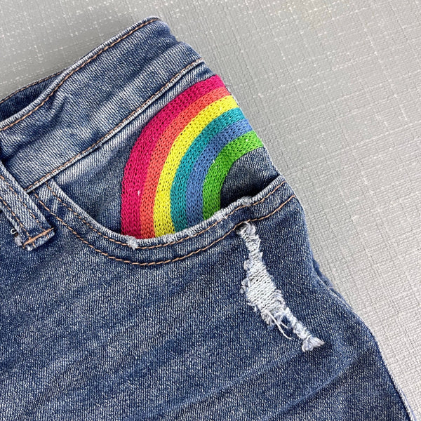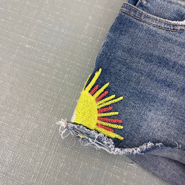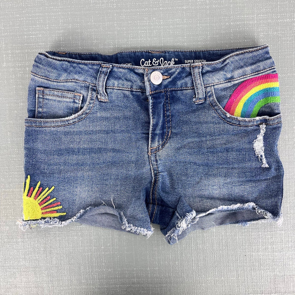 Cat & Jack Rainbow Stitch Denim Shorts. Girls size 6 years. Blue jeans cut off style shorts with adjustable elastic tabs in the waist. Fun sun and rainbow design. Great condition!