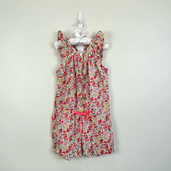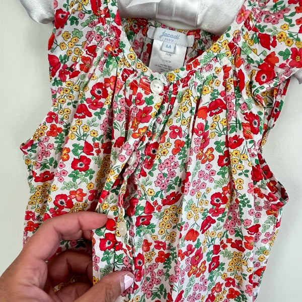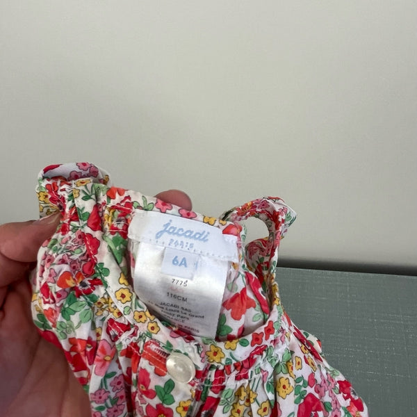 Jacadi Paris Floral Ruffle Romper. Girls size 6 years. One piece jumpsuit outfit. Sleeveless ruffle top and shorts bottom. Has hidden buttons and tie at the waist. Gorgeous flower print! Excellent condition.