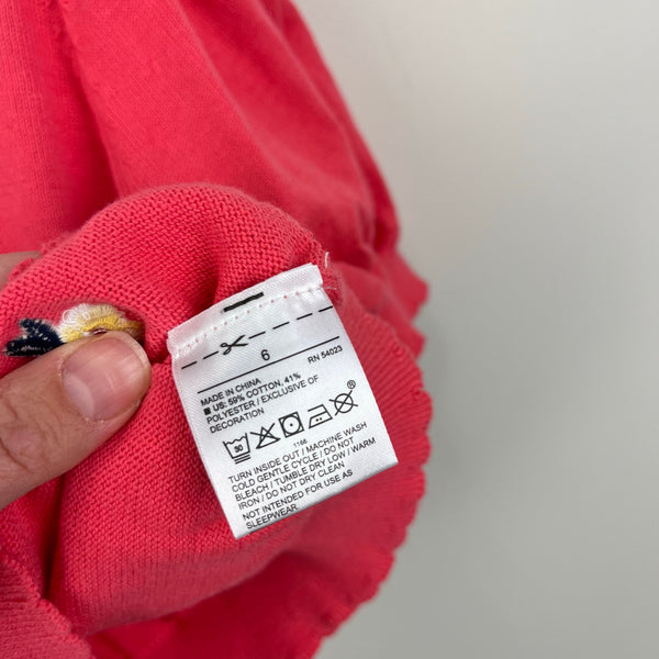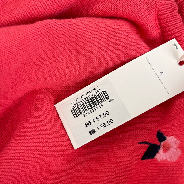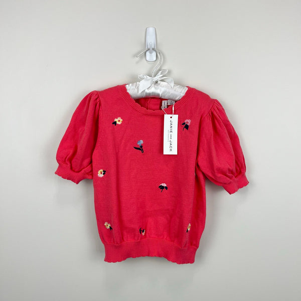 Janie and Jack Floral Embroidered Sweater Bella Jewel Pink. Girls Size 6. Brand new with tag (NWT). Short, puff sleeve pullover sweater with ribbed scalloped trim and button back. Coral pink with embroidered green, blue, and yellow flowers. So sweet for spring!