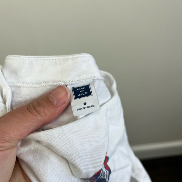 Janie & Jack Long Sleeve Shirt. Little girls size 6. Casual long sleeve top. Creamy white with gold colored buttons on the shoulders. Fun print with girl wearing sunglasses. Light wear (mostly just wrinkles; sorry!) and faint blue mark in back (pictured).