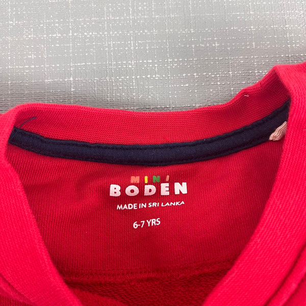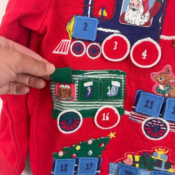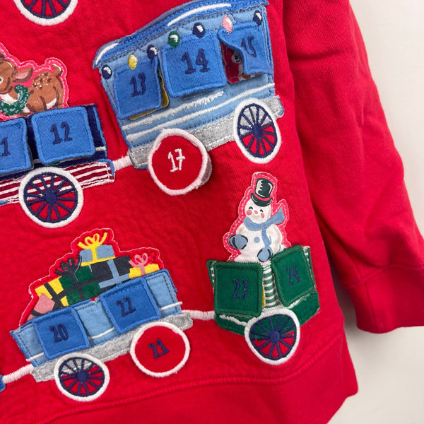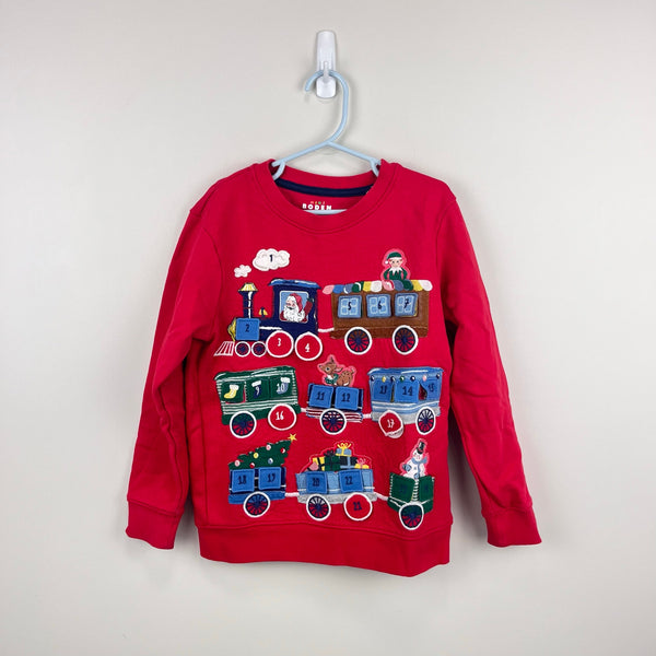 Mini Boden Advent Calendar Sweatshirt Red. Boy or girl size 6-7 years. Cozy crewneck pullover sweatshirt featuring an applique lift-the-flap Christmas train. Festive design features Santa, presents, and more! Worn once for a few hours. Washed on cold and line dried. Retail $64. Sibling matches available upon request (sizes 7-8 and 8-9).