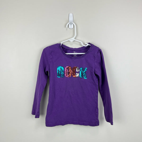 The Children's Place Purple Sequin ROCK T-Shirt. Girls size small (5-6 years). Casual long sleeve top with fun sequin design. Light wear and a pin hole (see photo). Perfect for every day wear to school or the playground for your budding rock star!