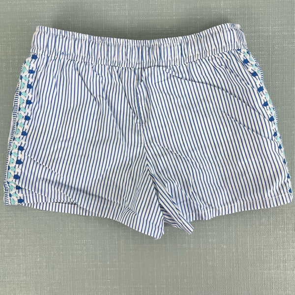 Vineyard Vines Girls Pop Embroidered Pull-On Shorts. Girls size extra small (5-6 years). Cozy, lined blue and white striped seersucker shorts with embroidery down the sides. Elasticized waistband with self drawstring. Two front slash pockets. Perfect for summer paired with a simple tank!