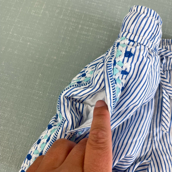 Vineyard Vines Girls Pop Embroidered Pull-On Shorts. Girls size extra small (5-6 years). Cozy, lined blue and white striped seersucker shorts with embroidery down the sides. Elasticized waistband with self drawstring. Two front slash pockets. Perfect for summer paired with a simple tank!