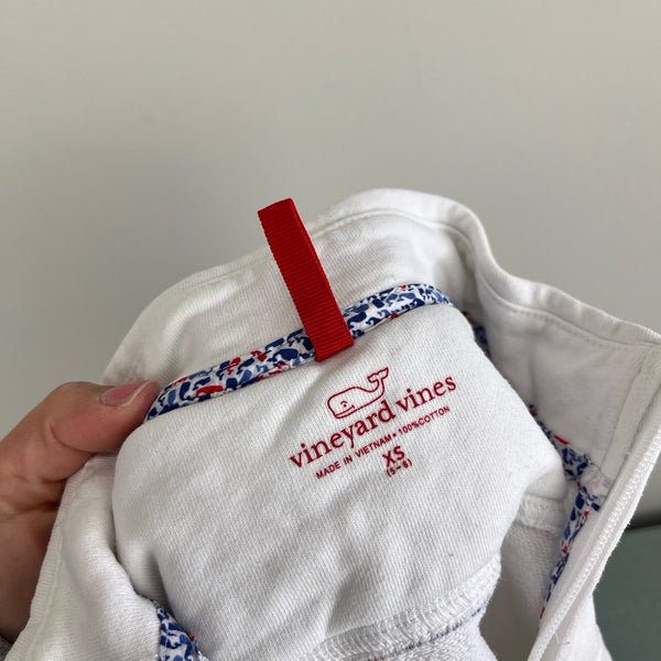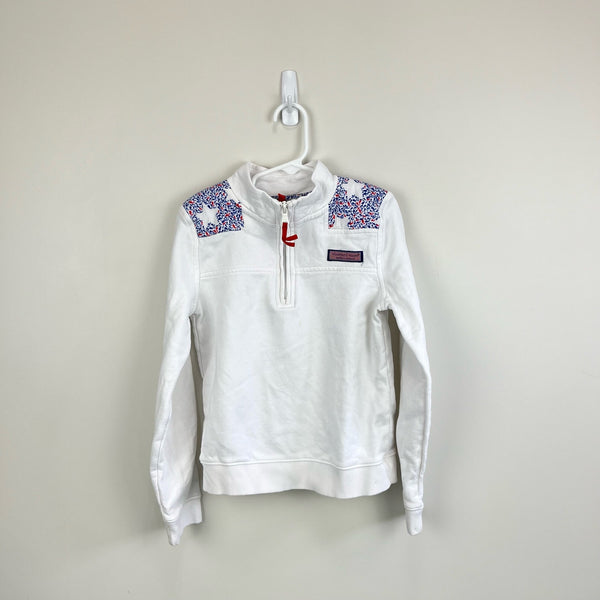 Vineyard Vines White Stars Shep Shirt. Girls size extra small (5-6 years). Classic, preppy quarter zip pullover sweatshirt. White with patriotic red and blue stars and whales across the shoulders. Has a couple small, faint marks (see last photo; untreated).