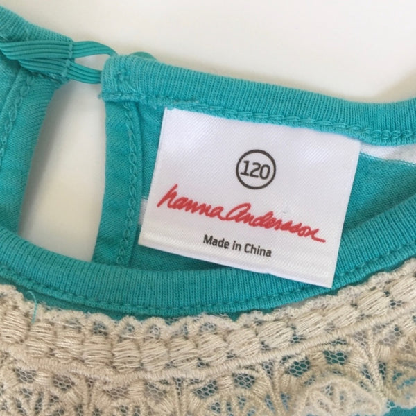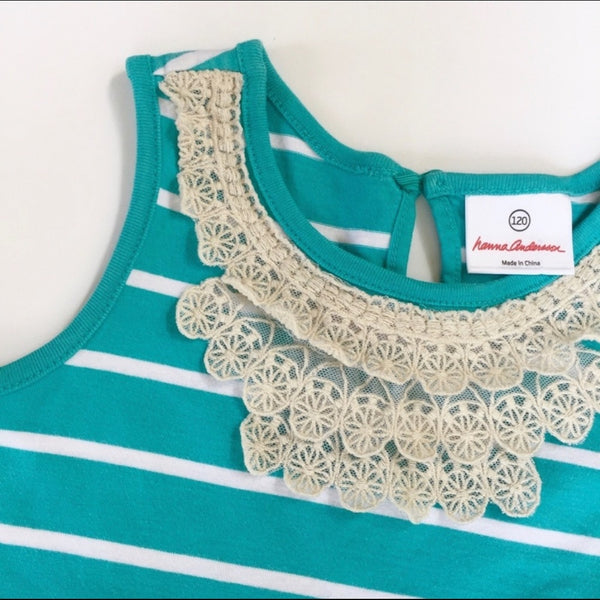 Hanna Andersson Sleeveless Lace Collar Dress. Girls size 120 cm (US 6-7 years). Pretty teal/aqua green color. Tiny snag near bottom, but otherwise great condition!