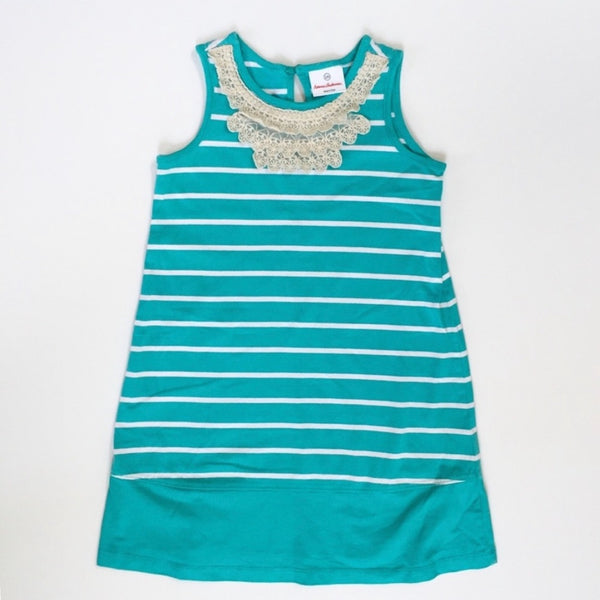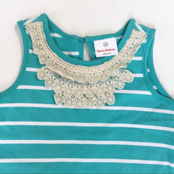 Hanna Andersson Sleeveless Lace Collar Dress. Girls size 120 cm (US 6-7 years). Pretty teal/aqua green color. Tiny snag near bottom, but otherwise great condition!
