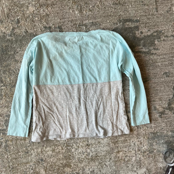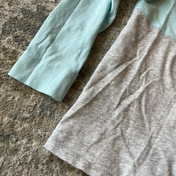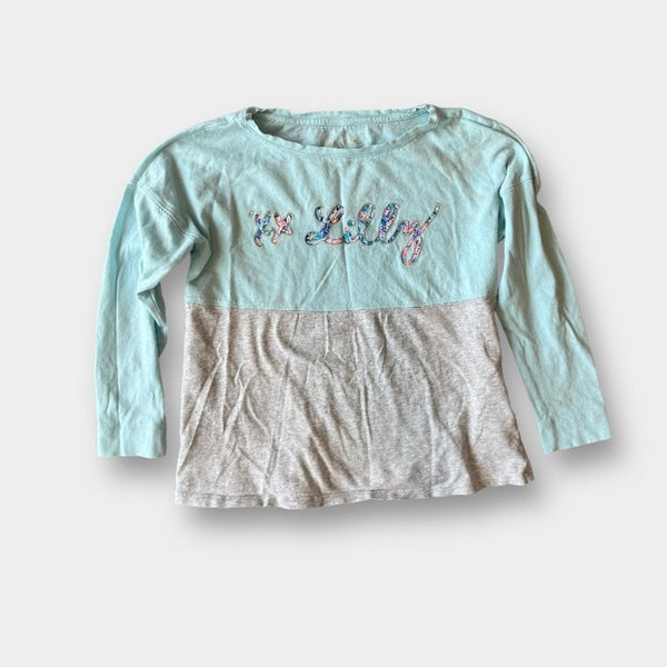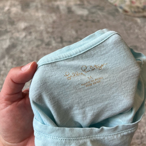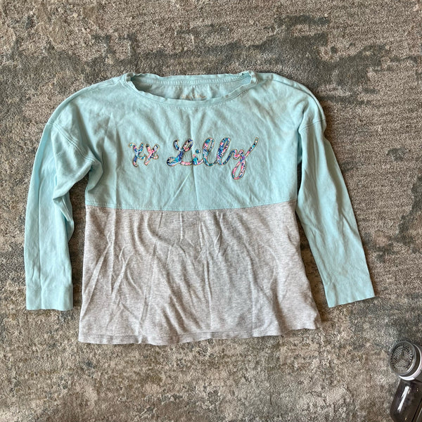 Lilly Pulitzer Girls Mini Finn T-Shirt Blue Oasis Tiny. Girls size medium (6-7 years). Gray and light green/blue color block with xoxo Lilly in colorful print. Just noticed a light mark (see close up photo; untreated), but otherwise great condition! Color was hard to capture; most accurate in photo holding shirt.