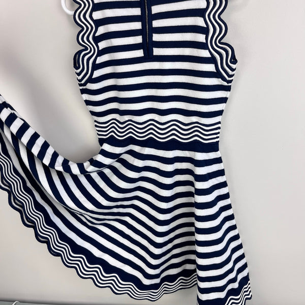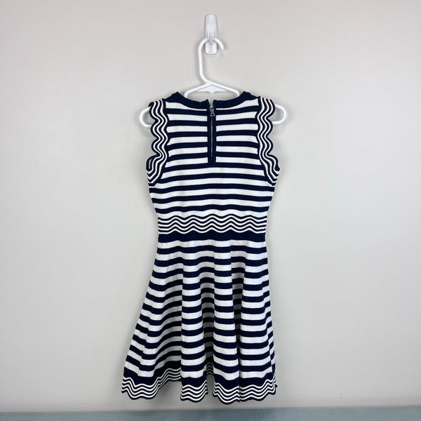 Milly Mini Textured Wave Flare Dress Navy Blue Stripes. Girls size 7-8 years. Brand new with tag (NWT). From high-end designer MILLY. Retail $150. Sleeveless knit dress in navy blue and white stripes with wavy ruffle sleeves and hem. Zipper in the back. Full skirt is perfect for twirling!