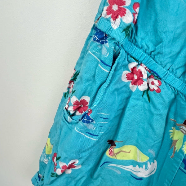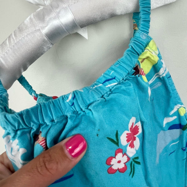 Mini Boden Bead Playsuit Romper Corsica Blue Island Adventure. Girls size 6-7 years. Sleeveless one piece outfit Fun tropical print features hula dancer girls, palm trees, whale tails, and more! Beads along the neckline and elasticized waistband. Lightweight material is perfect for hot summer days! A few small marks and some discoloration in the back (see last two photos; untreated).