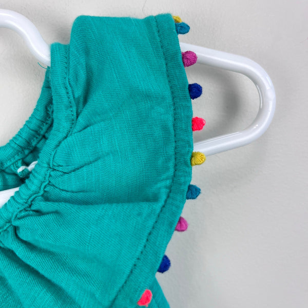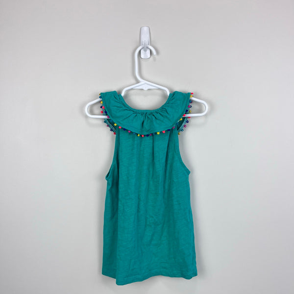Mini Boden Charlie Pom Jersey Tank Top. Girls size 7-8 years. Casual sleeveless green shirt with rainbow pom poms along the ruffle neck. So cute paired with jean shorts! (Same style shown on my daughter in a different color.) Excellent condition.