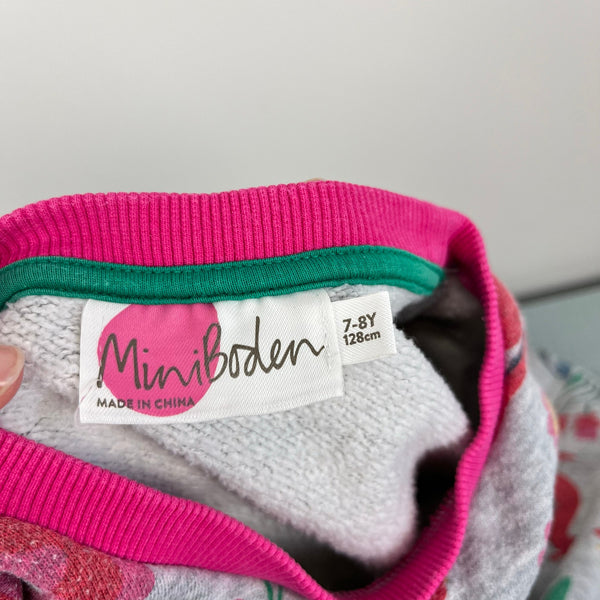 Mini Boden Cosy Printed Sweatshirt Dress Grey Fairytale. Girls size 7-8 years. Cozy long sleeve dress is perfect for fall and winter! Gray with colorful flowers, knights on horses, and dragons, too. Wear from the wash and a couple super faint marks (see photos).