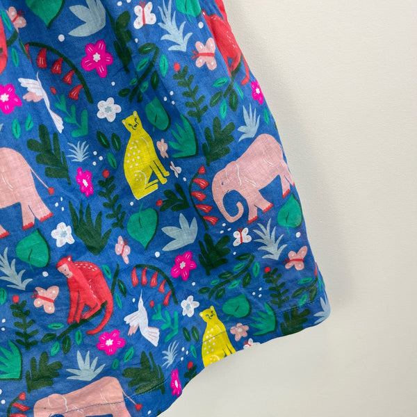 Mini Boden Girls Blue Animal Print Tank Top. Little girls size 6-7 years. Sleeveless dressy shirt with ruffle collar and v-back. Lined. Blue with colorful jungle animal print. Excellent condition!