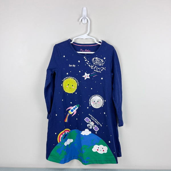 Mini Boden Space Big Applique Dress Starboard Blue. Girls size 6-7. Long sleeve navy blue jersey dress with fun and informative space-themed design - a smiling sun, the earth, a rocket ship, shooting star, and more! Has pockets! Excellent condition.