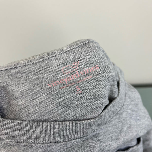Vineyard Vines Girls Snowboard Whale Long Sleeve Pocket T-Shirt. Girls size small (7-8 years). Casual long sleeve heather gray top with pink and purple winter whale on the pocket and back. A couple light marks on the sleeves (see photos; untreated) but otherwise great condition; only worn a couple times.