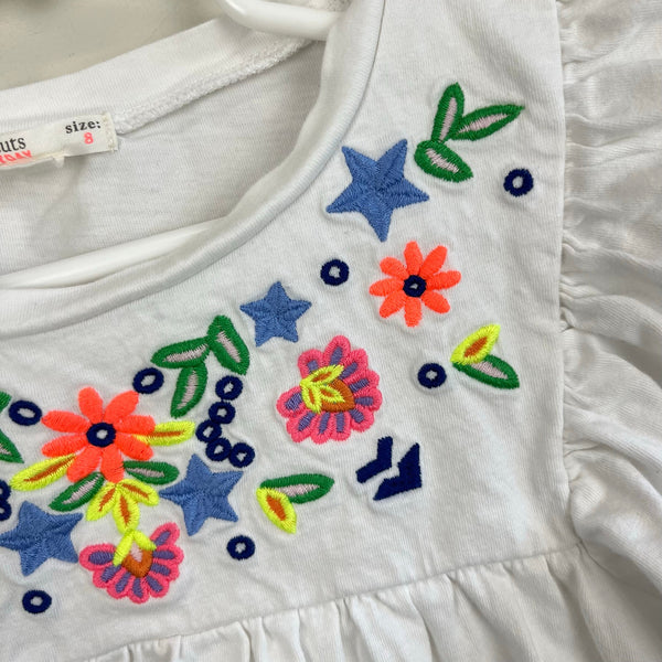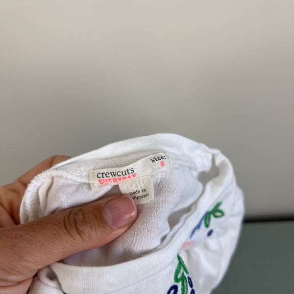 J. Crew Kids Everyday Embroidered Flutter Sleeve Top. Girls size 8. Short sleeve dressy tee shirt. White with colorful embroidery at the chest. Faint mark (see photo; untreated), but otherwise excellent condition.