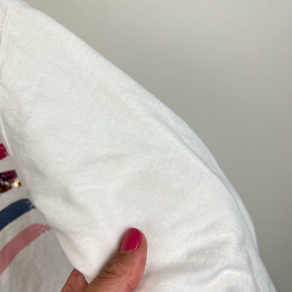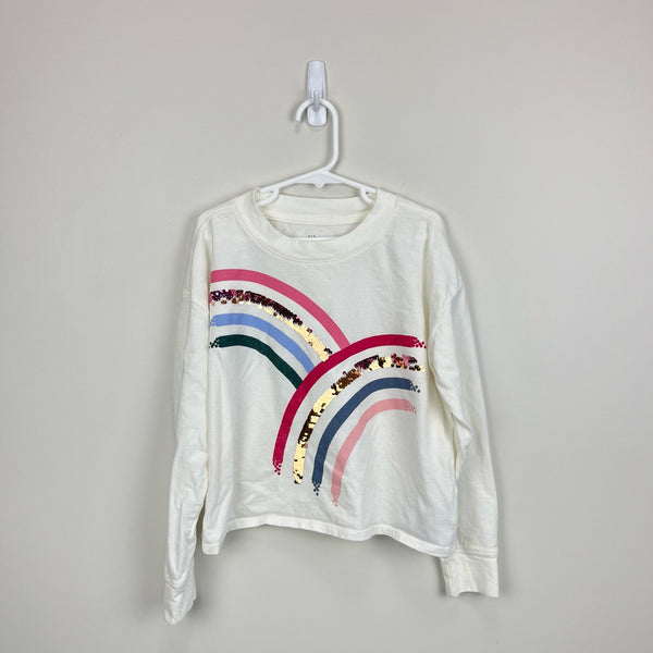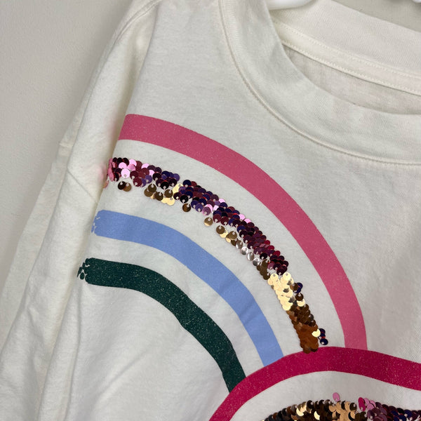 Gap Kids Double Rainbow Sequin Tee Shirt Long Sleeve. Girls size medium (8 years). Super soft long sleeve white top with colorful double rainbow design. Worn and washed once, though does have a super faint mark on the sleeve (see last photo; untreated).