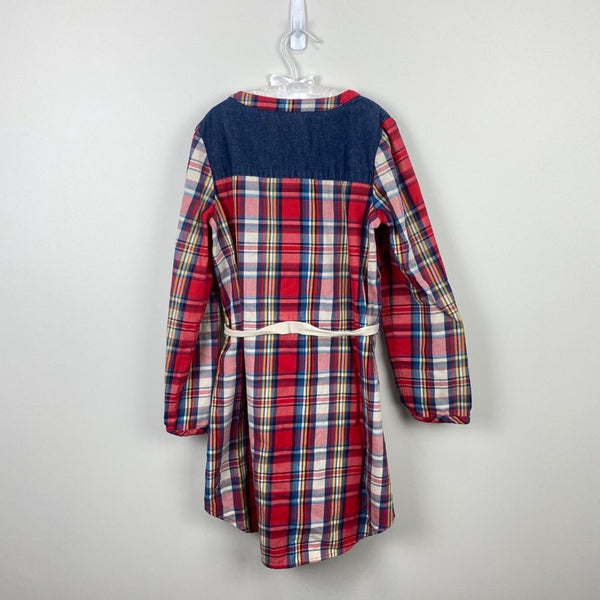 Hanna Andersson Girls Plaid Shirt Dress. Little girls size 130 cm (US 8 years). Casual long sleeve dress in cream, blue, and red plaid. Buttons down the center, denim around the neckline, and a tie at the waist. Easy to dress up for the holidays, but perfect for casual every day play, too! Excellent, like new condition.