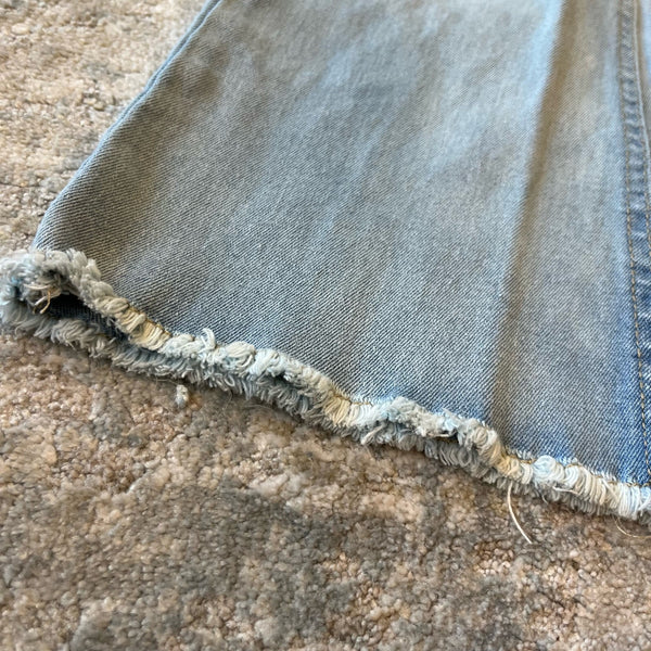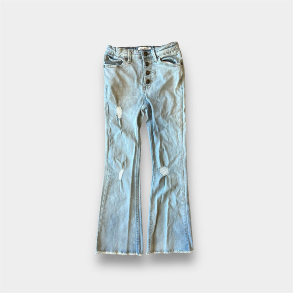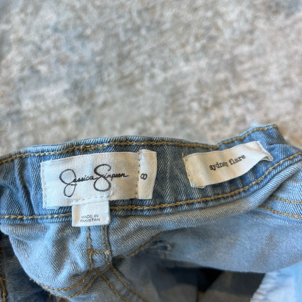 Jessica Simpson Girls Button Fly Light Wash Sidney Flare Leg Distressed Jeans. Girls size 8. Adjustable tabs in the waist. Good stretch for a perfect fit. Retro, vintage style with distressing and frayed hem. Worn and washed once or twice, just wrinkled from sloppy folding in my daughter's drawer!