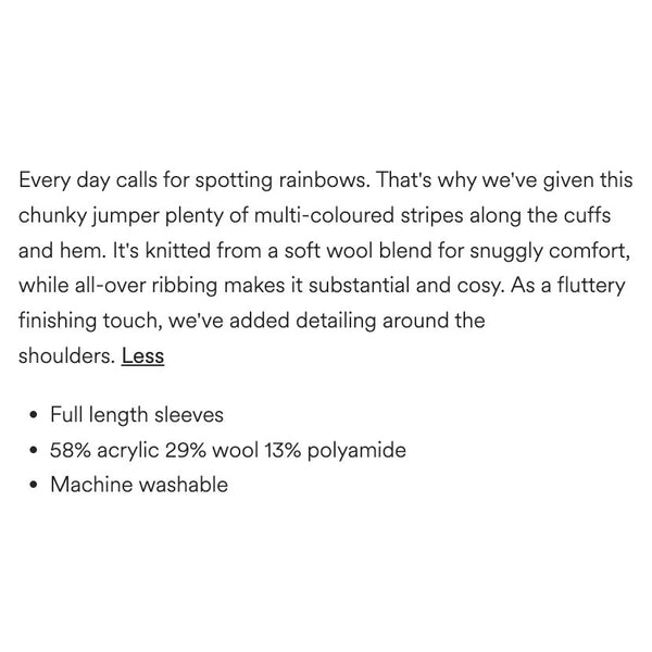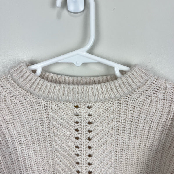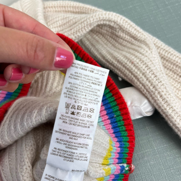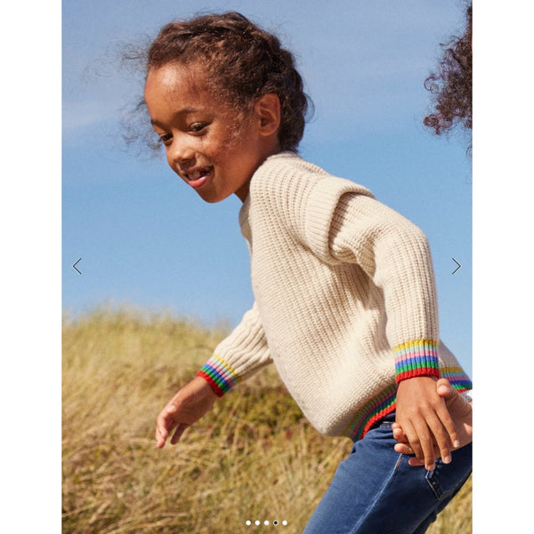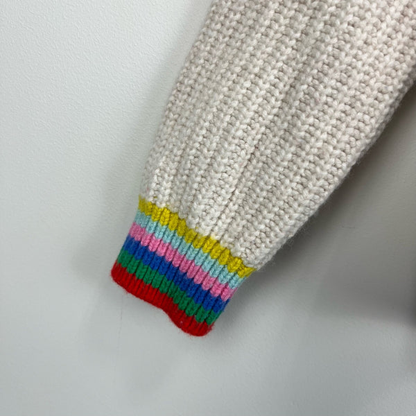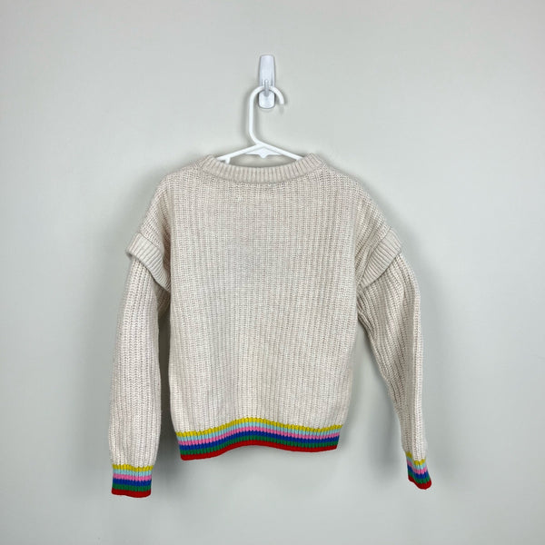 Mini Boden Girls Rainbow Rib Sweater Ecru. Girls size 8-9 years. Chunky cream pullover sweater in super soft wool blend. Fun flutter detail at the shoulders and colorful stripes at the cuffs and hem. Great condition with minimal wear. So, so cute for fall and winter!