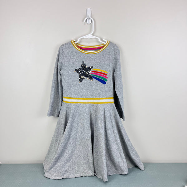 Mini Boden Sequin Star Applique Sweatshirt Dress Gray. Girls size 8-9 years. Fun, twirly skater dress with rainbow applique shooting star on the chest and golden yellow and white ribbed stripes at the neckline and waist.