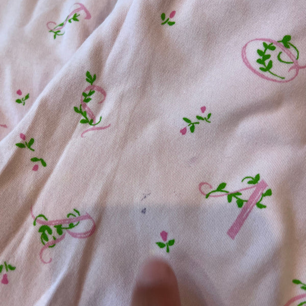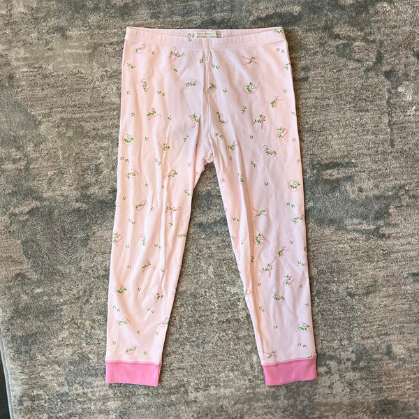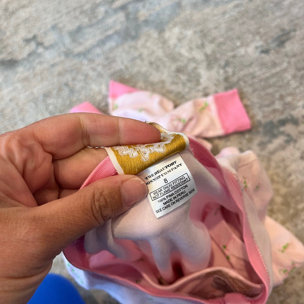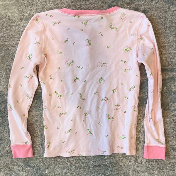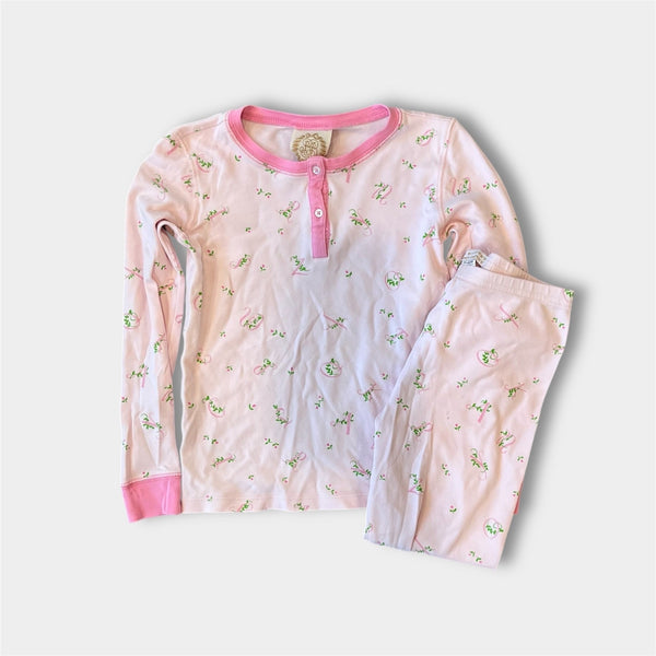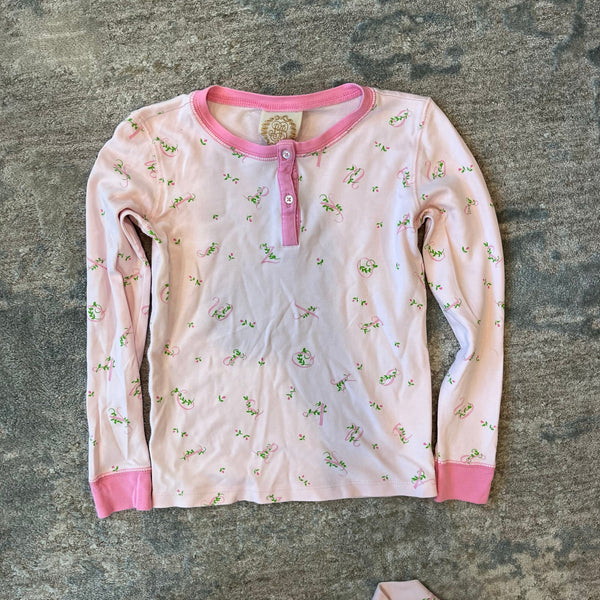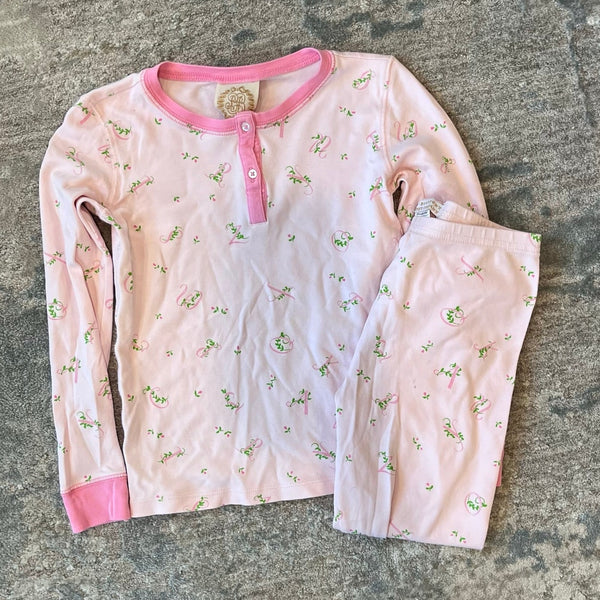 TBBC Sara Jane's Sweet Dream Pajamas Pink Alphabet. Girls size 8. Long sleeve two piece PJ set. Super soft 100% pima cotton - these took over Hanna Andersson as my daughter's favorites! Light pink with pretty greenery and script letters. Just noticed tiny marks (see last photo; untreated), but otherwise excellent condition.