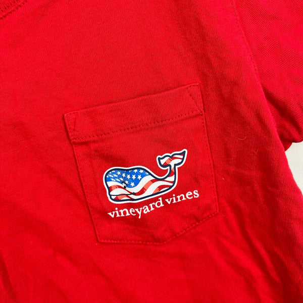 Vineyard Vines Short Sleeve Whale T-Shirt. Girls size small (7-8 years). Casual short sleeve crimson red top with preppy American flag whale on the front pocket and in the back. Perfect for 4th of July and all summer long!