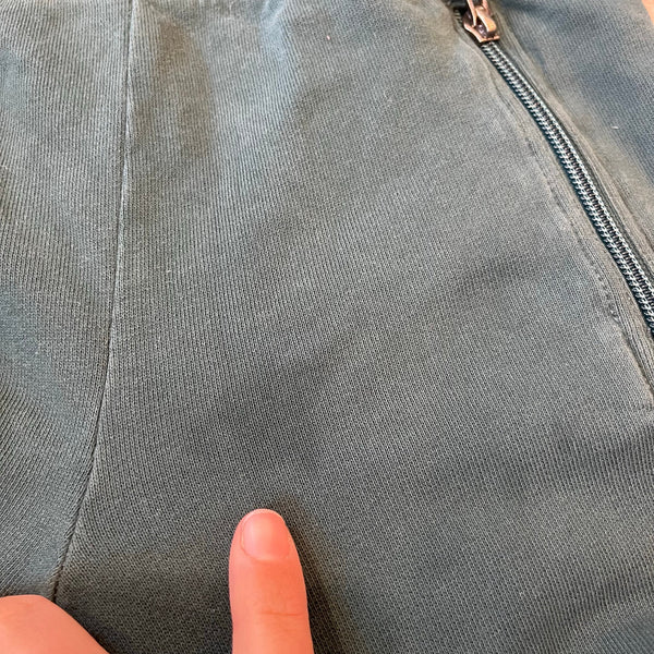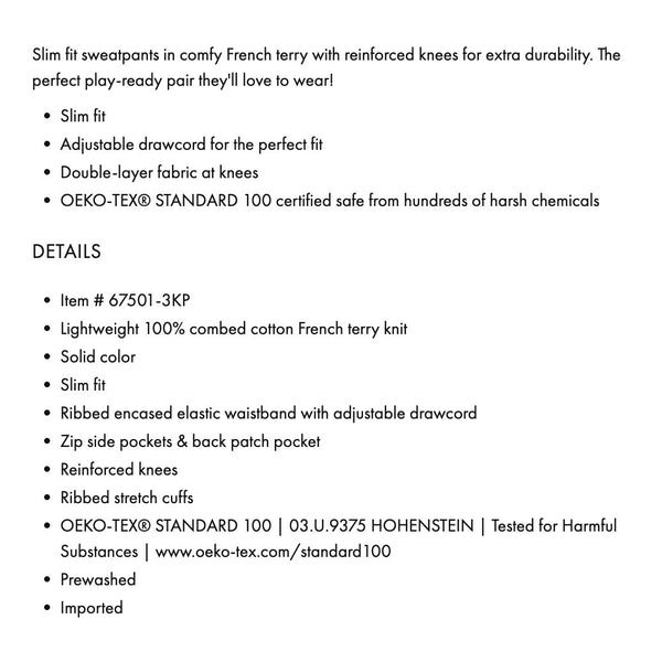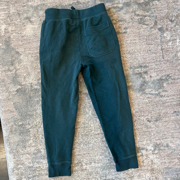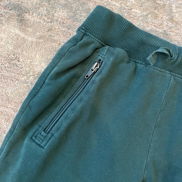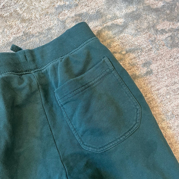 Hanna Andersson Slim Fit French Terry Double Knee Sweatpants Green. Boy or girl size 120 cm (US 6-7 years). Cozy pull on joggers with drawstring waist and zippered pockets. Super faint mark near pocket (see close up photo; untreated). Retail $49.
