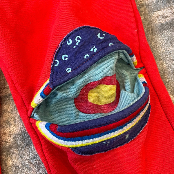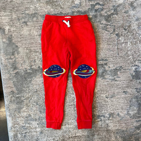 Mini Boden Appliqué Knee Joggers Red Planets. Boys size 7. These sweatpants are so fun! Elasticized drawstring waist and pockets in the front and back. The applique at the knees opens to the insides of the planet. Light wear.