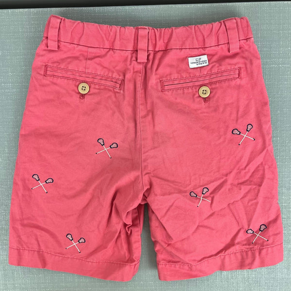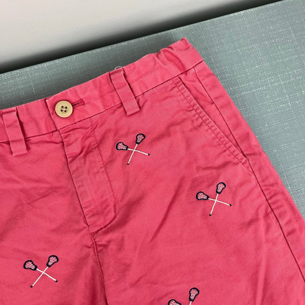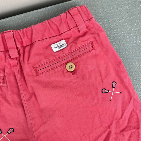 Vineyard Vines Jetty Red Embroidered Lacrosse Chino Shorts. Boys size 7. Classic, preppy style with embroidered lax sticks. Easy to dress up with a button down shirt or wear casually with a tee! Adjustable tabs in the waist. Light marks (see last photo; untreated).